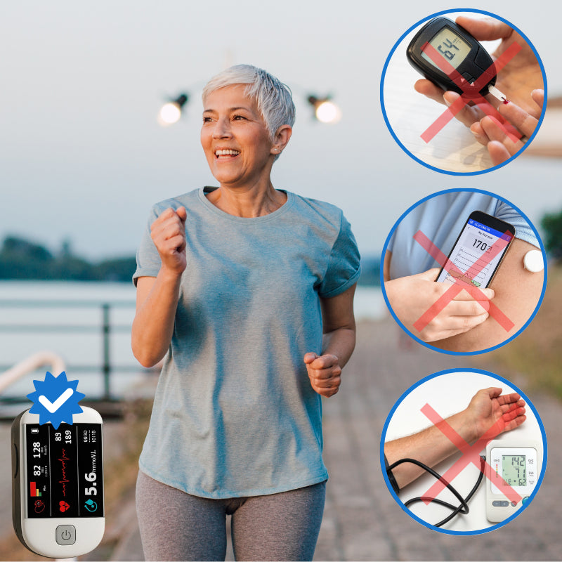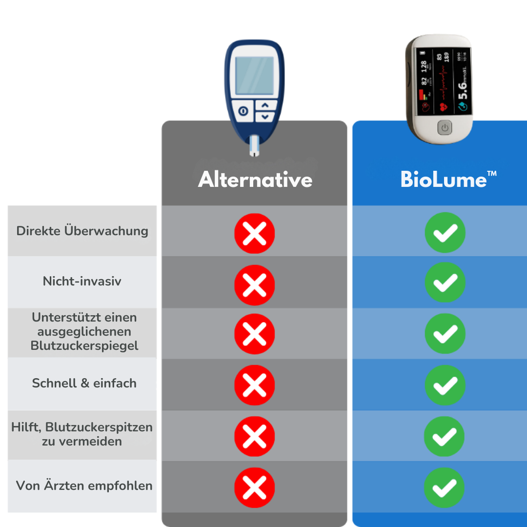 BioLume™ kann Blutzucker, Puls und Sauerstoff messen – schnell und einfach.
